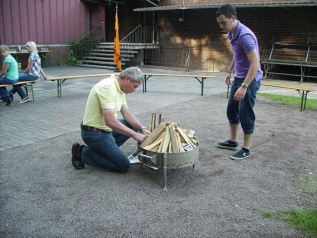 Jürgen Händler zündet das Lagerfeuer an - Rechts Philipp Pinger - 09.08.2008