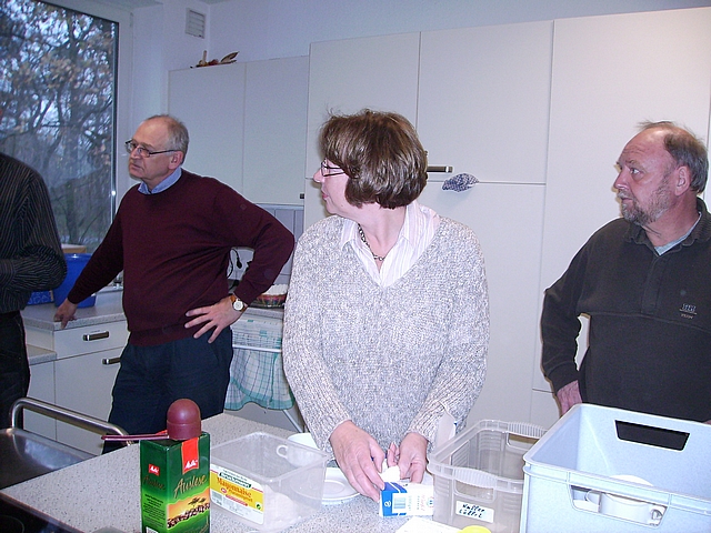 in der Küche beim Kaffeetest: Pfr Möller, M. und N.Hoffacker