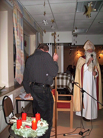 Der Nikolaus hat J.Händler den Stab gegeben und unterhält sich mit den kleinen Gästen