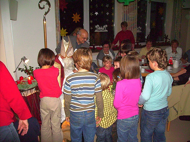 Nikolaus verteilt Tüten mit leckeren Sachen an die Kinder