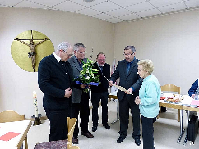 v.l.nr.: Präses Pfarrer Heinz-Josef Möller, stellv. Bezirksvorsitzender Horst Grossjung, stellv. Kassierer Wolfgang Hecker, Vors. Michael Schulz, Anneliese Sauer