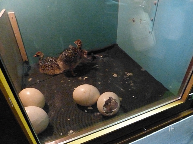 Remagen - Gemarkenhof - Straussenfarm - ein Eintagesküken und ein Küken bahnt sich den mühevollen Weg aus dem Ei.
