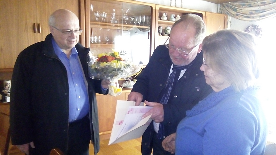Die Ehrung fand zu Hause bei Margret statt. Vorgenommen wurde sie durch die Vorstandsmitglieder Wolfgang Hecker (Mitte) und Dietmar Pinger (lks)