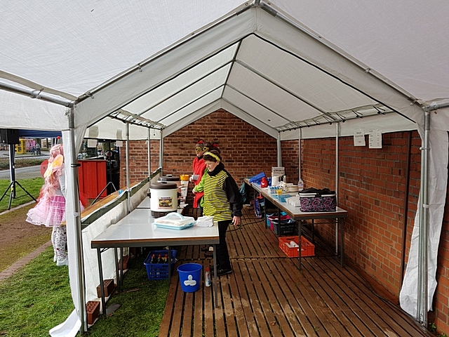 Verzehr -und Getränkestand der KAB an der Pauluskirche: Herrichten Sonntagmorgen
