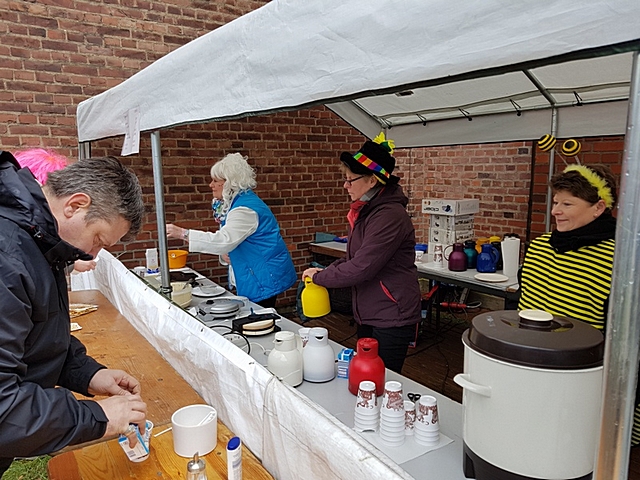 Verzehr -und Getränkestand der KAB an der Pauluskirche: Vor dem Zug am Sonntagmorgen