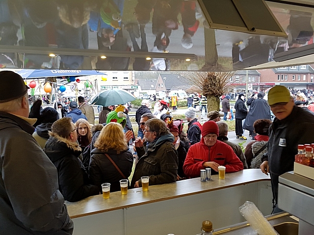 Verzehr -und Getränkestand der KAB an der Pauluskirche: Straßenkarneval nach dem Umzug