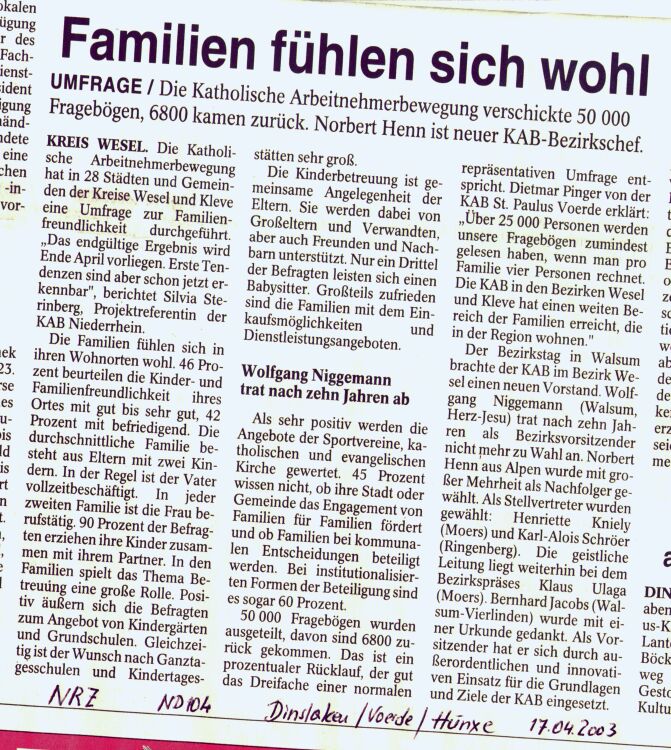 Als sehr positiv werden die Angebote der Sportvereine, katholische und evangelischen Kirche gewertet. 45 Prozent wissen nicht, ob ihre Stadt oder Gemeinde das Engagement von Familien für Familien fördert und ob Familien bei kommunalen Entscheidungen beteiligt werden. Bei institutionalisierten Formen der Beteiligung sind es sogar 60 Prozent. "Hier sehen wir einen erheblichen Informations- und Klärungsbedarf seitens der Kommunen", stellt Norbert Henn (Alpen) fest, neu gewählter KAB - Bezirksvorsitzender. "In den nächsten Wochen und Monaten werden wir in Informationsveranstaltungen über die lokalen Ergebnisse berichten. Wir wollen gemeinsam mit Familien, Verbänden und Vereinen, Bürgermeistern, Politikern und Initiativen die Probleme vor Ort angehen und Lösungen erarbeiten". Soweit der Vorsitzende der KAB Dingden, Roland Albers zur erschienen Presse.